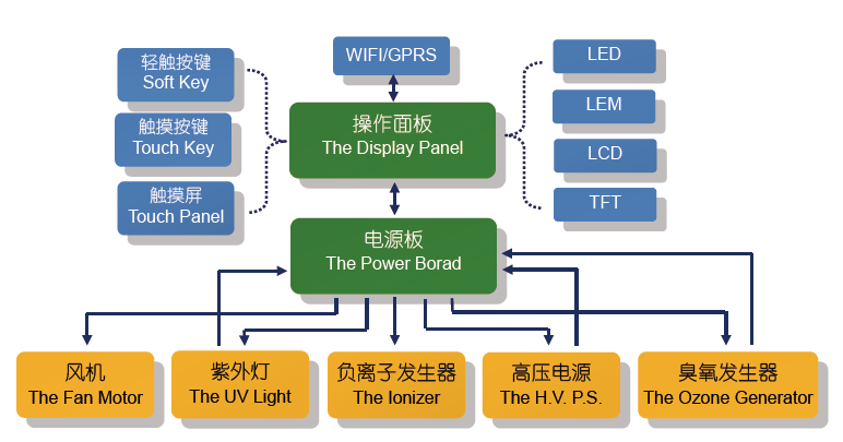 可(kě)控制(zhì)高(gāo)壓電(diàn)源、負離(lí∑'≠)子(zǐ)發生(shēng)器(qì)、紫外(wài)燈管、淨化(huà)管或臭氧發生(shēng)器(qì)等淨化(huà)部件(jiàn)
