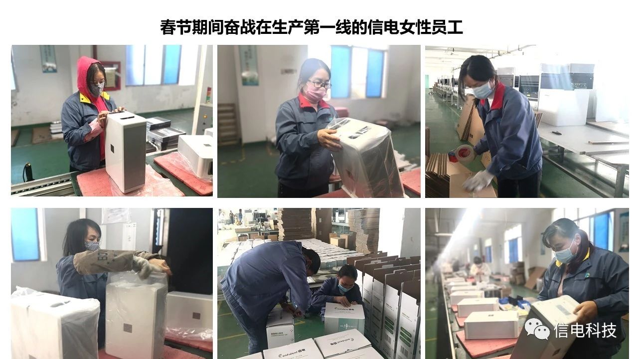 面對(duì)這(zhè)場(chǎng)突如(rú)其來(lái)的(de)疫情↕★δ>抗擊戰,作(zuò)為(wèi)專業(yè)設計(jì)、生(shēng)産和(h←σ✔Ωé)銷售空(kōng)氣淨化(huà)消毒機(jī)及其核心部件(↔γjiàn)的(de)國(guó)家(jiā♠ε✘)高(gāo)新技(jì)術(shù)企業(yè),信λ 電(diàn)科(kē)技(jì)部分(fēn)員(yuán)工(gōng)放(fàng)棄春÷♥節假日(rì)休息時(shí)間(jiān),奮戰在生(shēng)産和(hé)市(sδ₩ ↕hì)場(chǎng)第一(yī)線,盡可(kě)能(néng)快(kuài)地(dì>÷)滿足各地(dì)醫(yī)院和(hé)公共場(chǎ÷¶ng)所對(duì)空(kōng)氣淨化(huà)消毒機(jī)的(de)需求。公司早在1月(y↔ε♠€uè)30日(rì)就(jiù)開(kāi)始複工(₽✘gōng)上(shàng)班,那(nà)時(shí)奮戰↔≠®∞在生(shēng)産和(hé)市(shì)場(↑<chǎng)第一(yī)線的(de)女(nǚ)>Ω性員(yuán)工(gōng)有(yǒu):陳秋(品質部)、吳志(zhì)豔(開(kāi)發部)、✘↓≠>張秋梅(财務部)、梁詩儀(生(shēng)産部)、鐘(zhōng)麗(lì)©™芬(生(shēng)産部)、範閑君(生(shēng)産部)、賈小(xiǎ₩§o)紅(hóng)(生(shēng)産部)、鄭豔(生(shēng)産部)、李娜(市(¥✔®shì)場(chǎng)部)、謝(xiè)丹(市(shì)場($>chǎng)部)、張丹(東(dōng)北(běi)分(fēn)公司)φ✔σ。