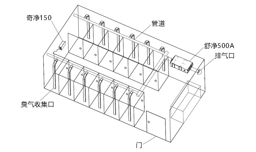将臭氣采集後集中除臭外(wài)排,公廁內(nèi)氣壓處于負壓,
