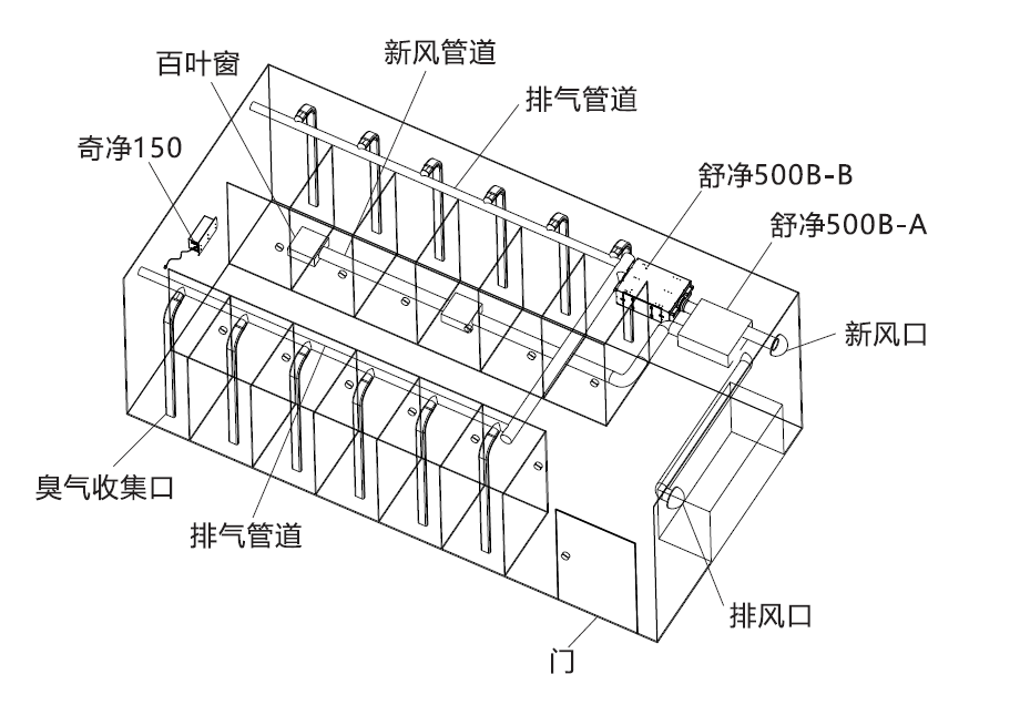 采用(yòng)舒淨系列單向流新風(fēng)除臭機¥•(jī)+奇淨系列除臭殺菌機(jī)