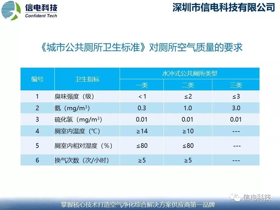 随著(zhe)時(shí)代的(de)發展π<<,人(rén)們對(duì)廁所空(kōng)氣質量的(de)要(y♥↔≥∞ào)求也(yě)跟著(zhe)提高(gāo),上(shàng)表是(shì)信電(§€diàn)科(kē)技(jì)總結各類有(yǒu♥€ ')關空(kōng)氣質量國(guó)家(jiā)标準,提出的(de)對(duì)廁所¶空(kōng)氣質量要(yào)求的(de)建議(yì)标準要(yào)求。